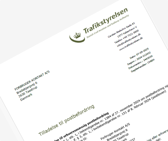 Hos FK Distribution sørger vi for, at din erhvervspost kommer sikkert og rettidigt frem – uanset hvor i landet modtagerne befinder sig. Som godkendt postbefordrer af Trafikstyrelsen arbejder vi efter klare krav og standarder, der sikrer høj kvalitet, fuld transparens og en driftssikker leverance hver gang.